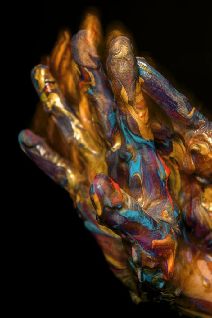 Les photographies de visages et de mains recouvertes de gouache de toutes les couleurs créées sont une véritable explosion visuelle de créativité et d’expression artistique. Dans cette série, les images transcendent les frontières traditionnelles de la photographie en fusionnant les techniques du portrait avec l’art pictural, offrant ainsi un mélange saisissant de réalisme et d’abstraction.